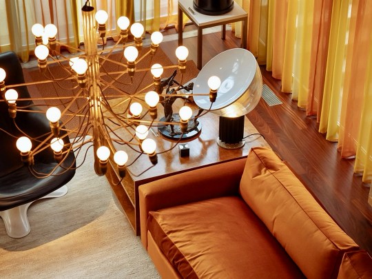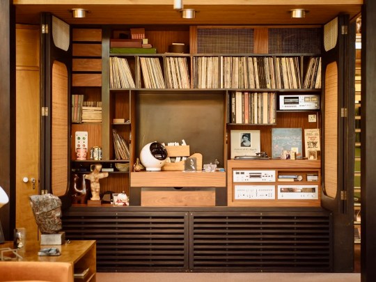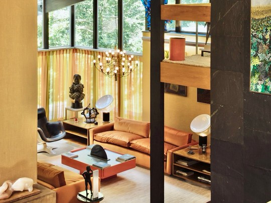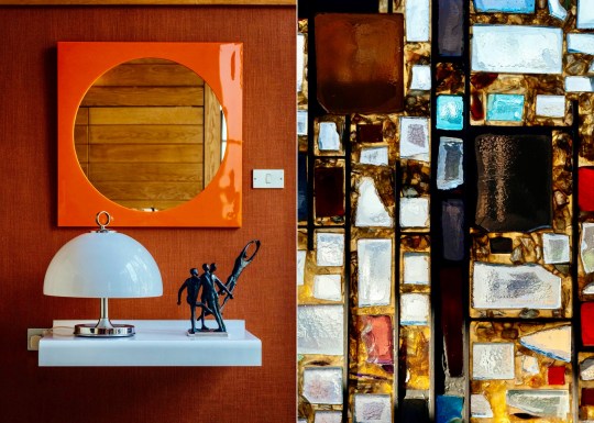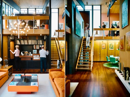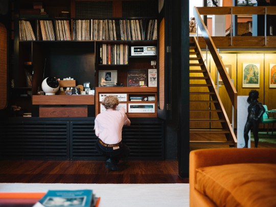 Descending the stairs brought you into the main living room. Orange velour Conran sofas anchored the space, paired with theatre-style Castiglioni lamps and a large coffee table with fold-down panels. An enormous sliding-door entertainment unit housed a 4-channel stereo and portable 8-track player on which Picker played classical music and contemporary musical theatre scores.