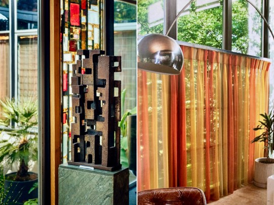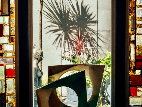 Stepping inside into the entrance hall, the hallway featured stained-glass windows crafted in the Daldevere technique, slabs set into resin within metal frames. Here, as throughout the house, the architecture was designed with specific artworks in mind: Terry Frost paintings and a Paul Mount sculpture mirrored the geometry and light of the vestibule while pieces by Dennis Mitchell, a studio assistant of Barbara Hepworth, sat alongside works by more established artists.