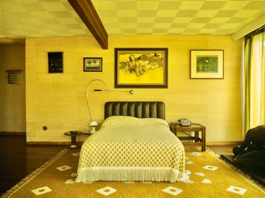 There was also a spare bedroom on the upper floor (in relation to which I could not find any images online!) which showcased a slightly bolder use of color: rose-colored walls, bright corduroy blue carpets and Habitat curtains. The Conran group also provided the bed linens, a Formica vanity unit and Marcel Breuer and Saarinen tables bought for purposes of putting art on them. Another Patrick Proctor painting of Ossie Clark and Christopher Gibb alongside Mt Fuji hung by above the bed.