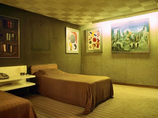 Also on the upper level was the library, featuring chocolate-brown hessian walls and a bespoke tropical laurel sideboard with a drop-leaf bureau and an integrated reel-to-reel tape deck, the best technology that could be bought at the time. The mid century modern furniture in the library and the rest of the house was selected by Terence Conran and represented the first domestic project by Conran Group, coinciding with introduction of the Habitat brand to the UK market and providing a testing ground for Habitat products. The mix of bespoke pieces by Conran, reissues of 1920s pieces and contemporary 1960s pieces were reportedly not to Picker’s taste as he preferred a chintzier style. In fact, anything that Conran didn’t select in the house (i.e. most of the art and knickknacks) were kind of chintzy – I wondered why someone with such chintzy taste would want such a cutting edge modernist home and was told that Picker had multiple other, more traditional homes and this one was built as something of a status symbol.