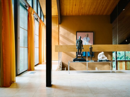 Beyond the entrance hall was an upper landing area with a stunning elevated perspective over the double-height living area below. A large, striking painting of Christopher Gibb by Patrick Proctor, an artist unfavorably compared to David Hockney at the time, overlooked the galleried area. The landing area was widened at Picker’s request to fit walnut piano from his previous house as the piano was said to work best up here acoustically.