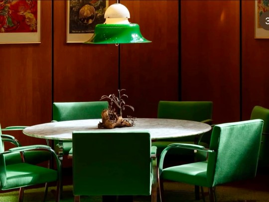 The adjacent dining room served as an entertaining space for regular dinner parties, with guests including Danny La Rue and Lionel Blair. This space featured pendant lighting and reupholstered emerald green Mies van der Rohe chairs, tying the room’s rug and accessories together. Original glassware, linens, and ceramics were stored neatly in bespoke cupboards adorned with lithographs by Chagall, a nod to Picker’s Belarusian heritage.