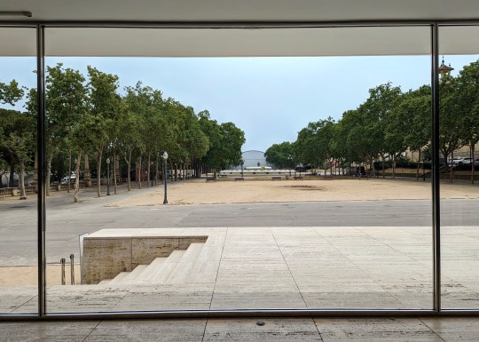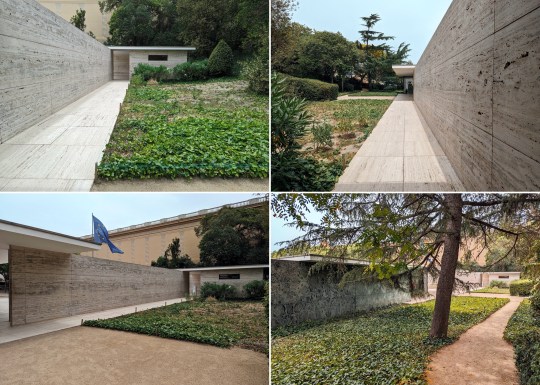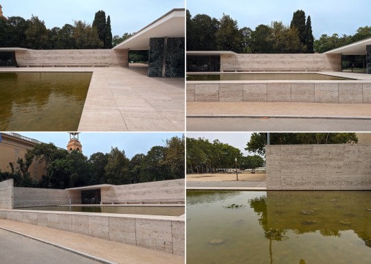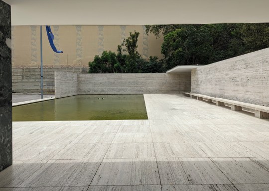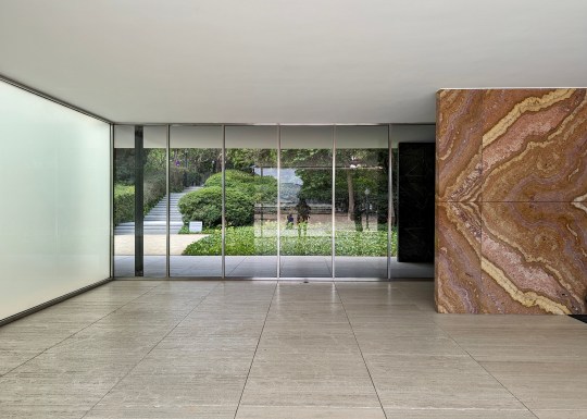 The pavilion was almost completely unfurnished except for the iconic Mies van der Rohe Barcelona chairs and stools, which I now mostly associate with corporate waiting areas. These chairs were reportedly designed to be used as thrones for the Spanish King and Queen when the German Ambassador received them.