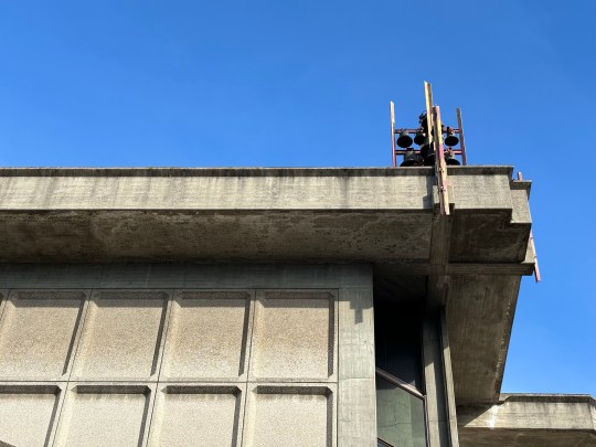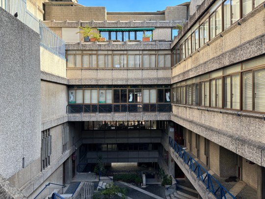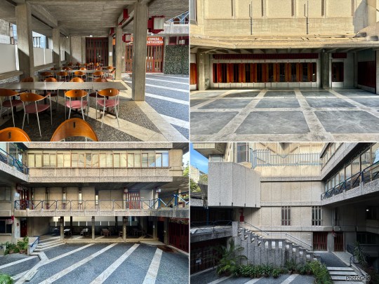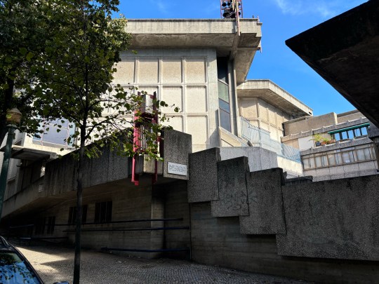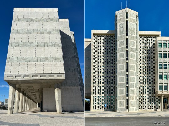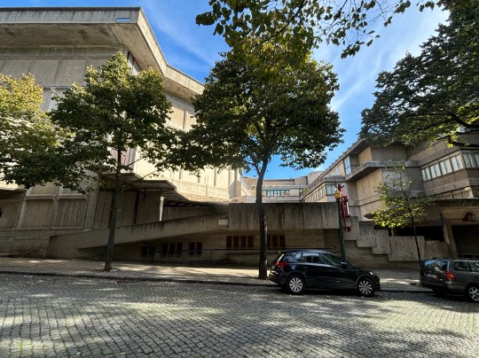 The building was long and rectangular, with large concrete columns supporting its cantilevered facade on all sides. This design made it look as if it was slightly lifted off the ground, giving it an unexpected sense of lightness despite its monolithic size. The materials and structure were typical of brutalism – strong, geometric, and functional – but with a unique Portuguese touch. Instead of the raw, heavy concrete often seen in brutalist buildings, the facade here was decorated with geometric patterns and rhythmic textures. This detail softened the building’s appearance, reflecting Portugal’s penchant for a patterned tile. The interplay of light and shadow on the textured concrete created a dynamic effect which must change throughout the day.