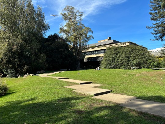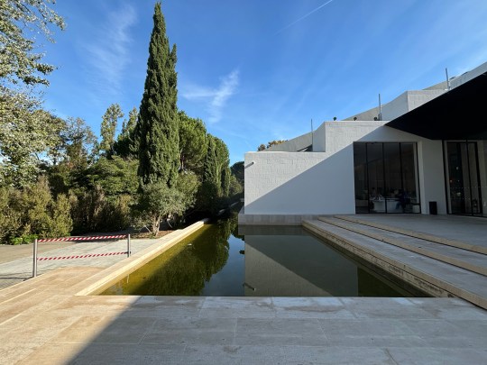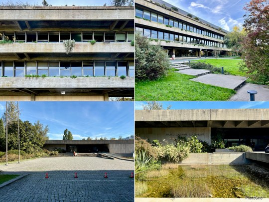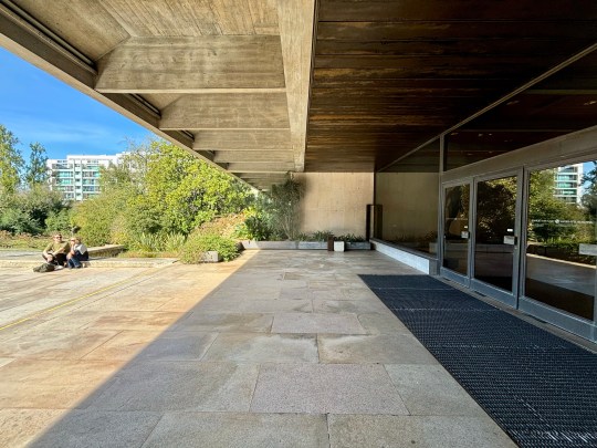 The main building museum was low and spread out, its concrete surfaces softened by the surrounding trees and water features.