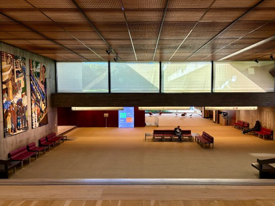 The layout consisted of large open plan areas connecting the concert halls, public spaces and administrative offices that made up the building. These vast carpeted areas were punctuated with attractive mid-century furniture, some of it built into the space.