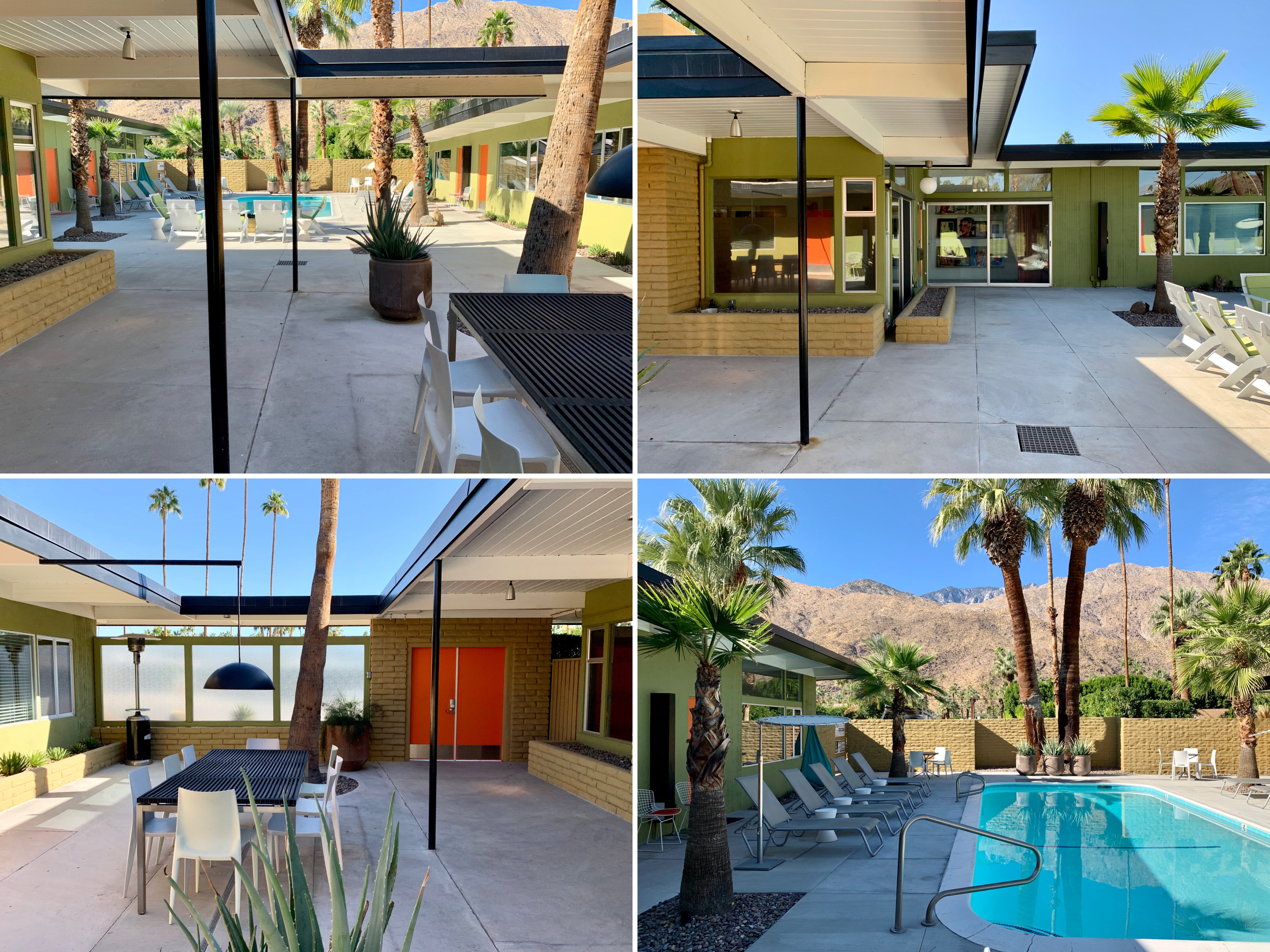Situated in the south end of town amid other hotel and motel complexes, the Desert Star complex was built in 1954 by Howard Lapham as an extended stay motel consisting of seven units surrounding a shared pool. The building is now a Class One site with a protected exterior (though the extent to which the architecture in Palm Springs is not protected by this Class/grading system shocked me), featuring a “colliding” roofline (note how the two roof panels do not meet at the apex in the photo below), which was built at a height which would make it look like the mountains behind were resting on the roof of building.
