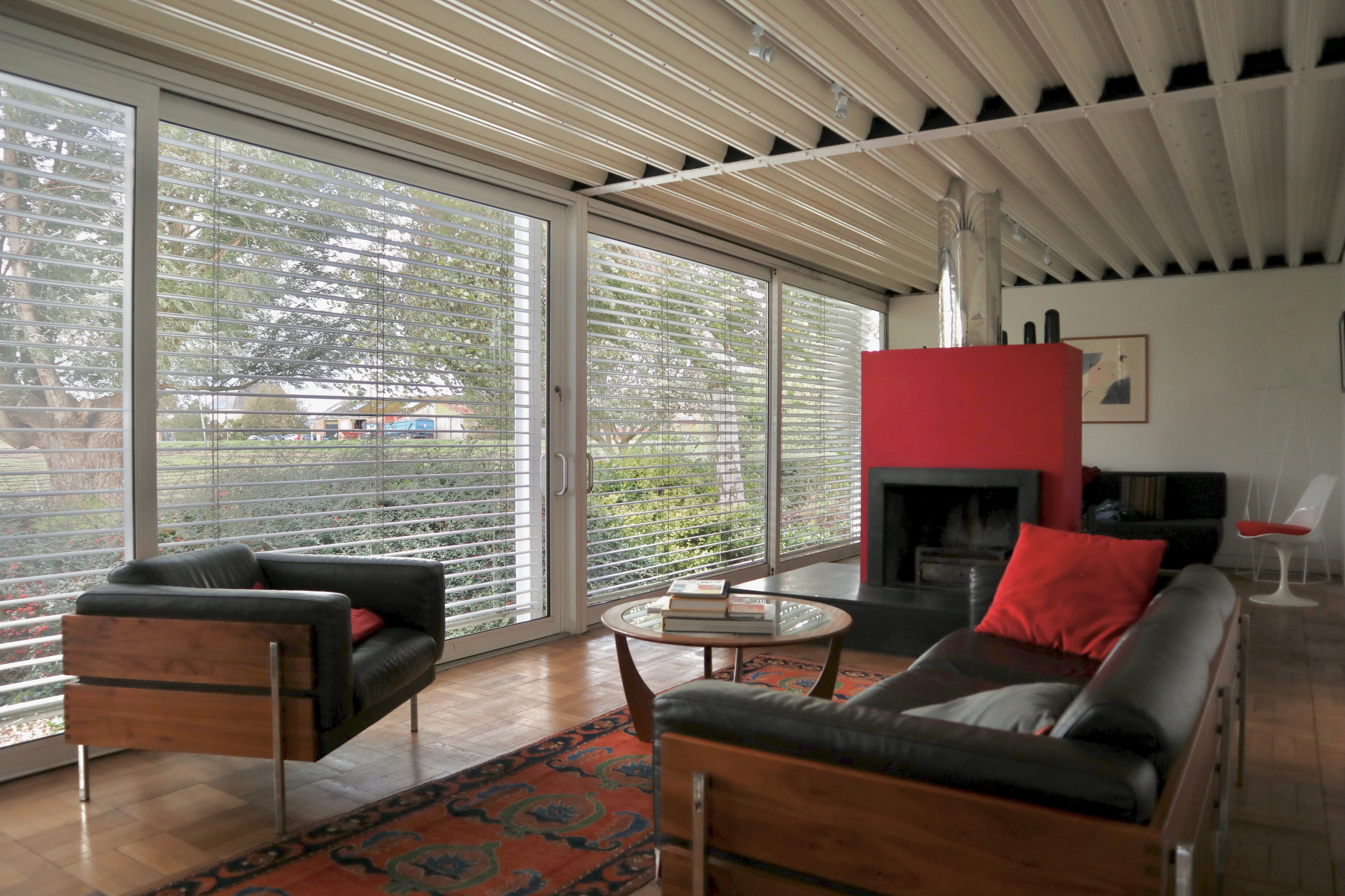The house was constructed using mostly steel and glass with a galvanised steel structural roof, the front elevation composed entirely of sliding doors opening out onto the Cambridgeshire Fens and offering views across agricultural land.