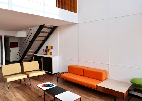 The apartment was arranged over two levels, opening from the seventh floor corridor onto a mezzanine level containing the original Cuisine Atelier Le Corbusier type 1 kitchen and a dining area overlooking the living area below. A Jean Prouvé-designed open tread steel staircase led down to the lower floor of the apartment which stretched all the way from one side of the building to the other with a balcony on each side (the building was designed with a interlocking scissor layout – the apartment across the corridor had a staircase leading to an equivalent upper floor spanning the entire width of the building).