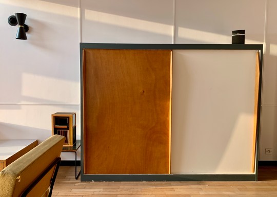 The lower floor living space contained a living area, a bathroom with separate toilet and shower cubicle built into a cupboard-like pod and two long, narrow bedrooms at the opposite end, each with their own sink and dressing area and divided by a sliding door. All of the rooms were furnished with original free-standing and built-in furniture, including “storage walls” with various cupboards with sliding doors designed by Charlotte Perriand in collaboration with Atelier Le Corbusier.