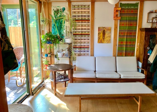 The upstairs floor, which consisted of two large rooms divided by a sliding partition door, was used by the owner as a living room and the master bedroom. This floor was very bright owing to the domed skylight above the staircase. We were told that this floor gets a bit too warm in summer.