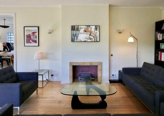 Two properties were open when I visited. The first was one of the maisonettes over the garage blocks. The apartment was reached via a communal walkway and comprised a conservatory-like entrance area, kitchen, living/dining area, bathroom and two bedrooms. The owners were clearly architecture and design enthusiasts and had restored a number of original features in the apartment including the wood panelling, black vinyl floor tiles and fireplace in the centre of the living area.