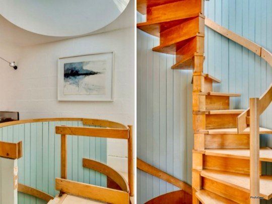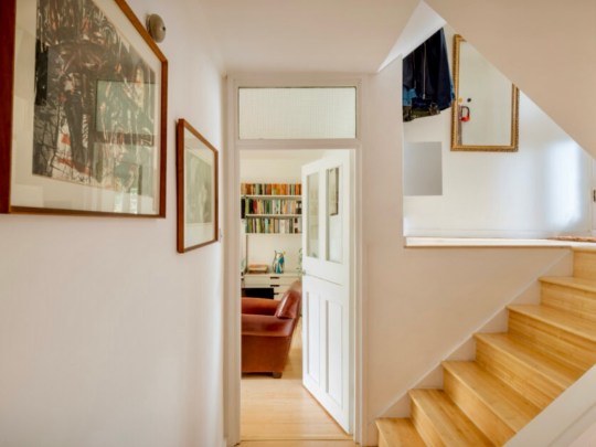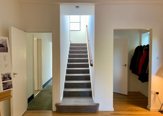 In the hallway was a very distinctive wooden staircase consisting of steps cantlivered from a central pole which anchored down into the concrete on the lower ground floor. The staircase led upstairs to the top floor and downstairs to a lower ground floor.