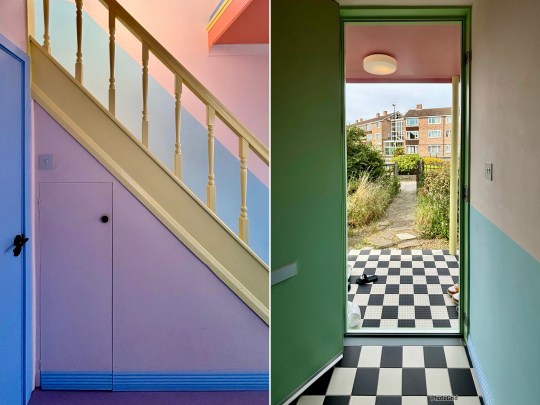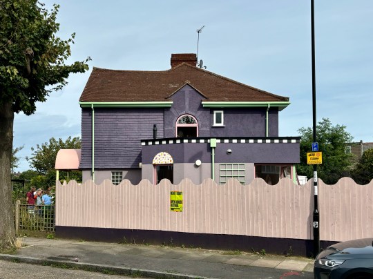 The exterior of the house was painted various shades of lilac offset by brightly colored drainage pipes, chequerboard-patterned tiles and a sculpted porch at the front with a striking pink hood supported by yellow columns.