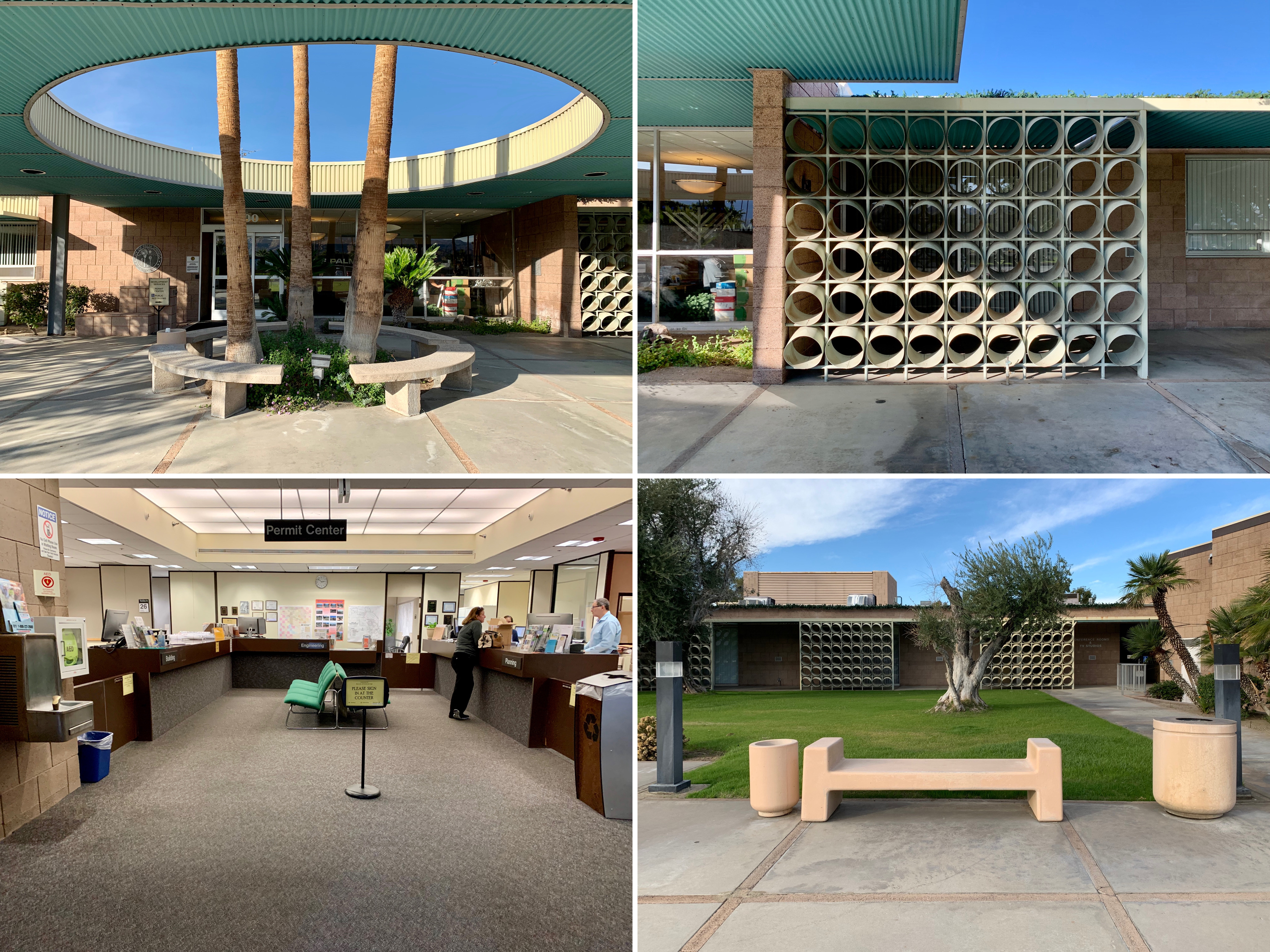 Palm Springs City Hall was a classic Albert Frey mid century design built between 1952 and 1957. Frey incorporated a distinctive portico overhang at the main entrance with a circular cut out (framing three tall palm trees which shoot up out of it) and used aluminium piping cut at right angles to create brise soleil, shielding the front of building from the intense morning and early afternoon sun. The facade and most of building reportedly looks much the same today as it did when it was completed in 1957. The interiors were comparatively dreary.