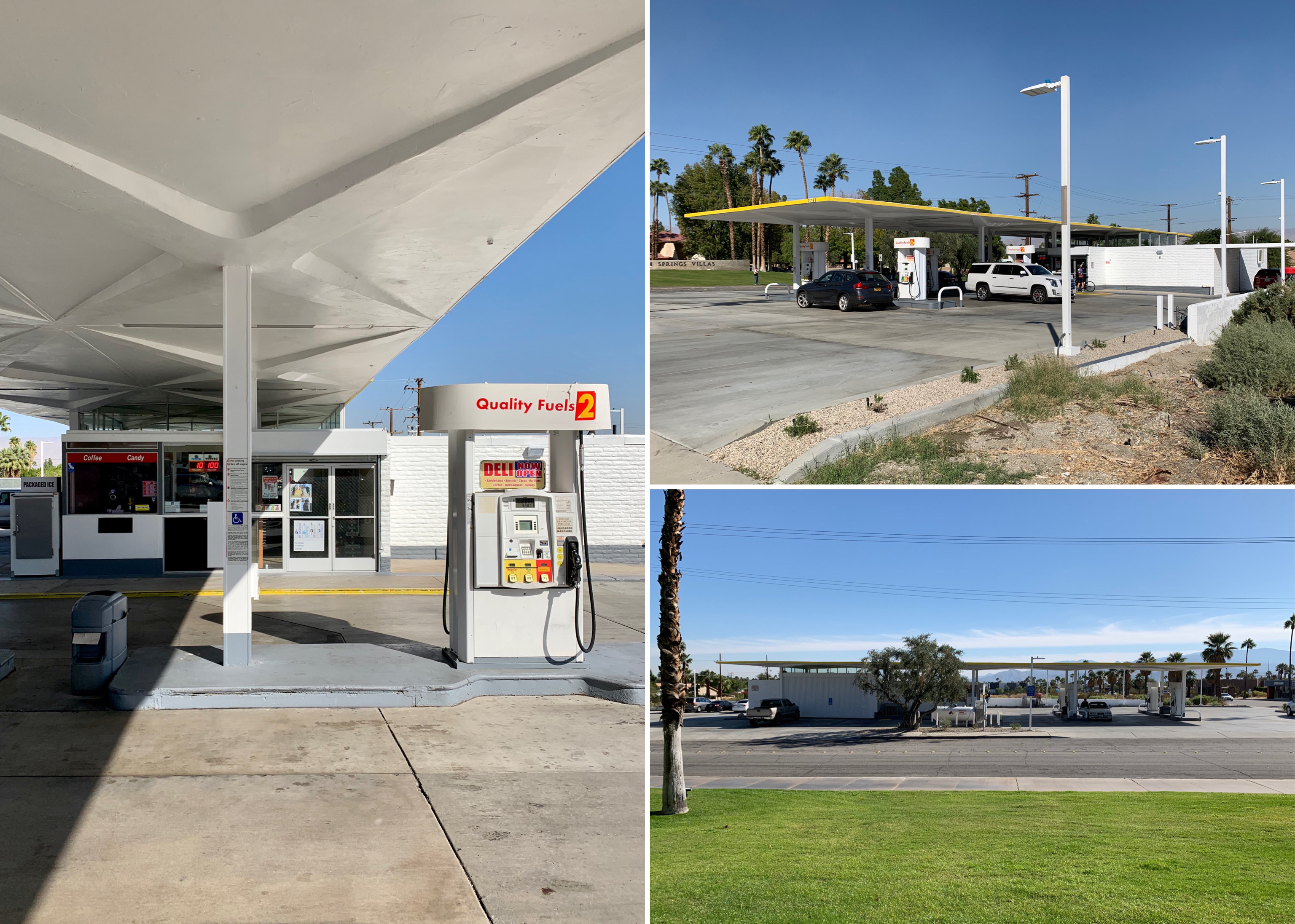 Designed by Albert Frey and Robson C Chambers and built in 1963-65, this former gas station with its distinctive cantilevered wedge-shaped metal canopy was converted into the Palm Springs visitors centre in the 2000s after a long period of disrepair and a unsuccessful stint as an art and sculpture gallery. It is referred to as the Tramway Gas Station due to its location at foot of Tramway Road, the long road leading to the entrance for the Palm Springs aerial tramway.