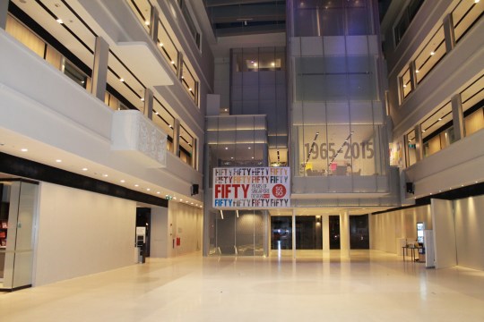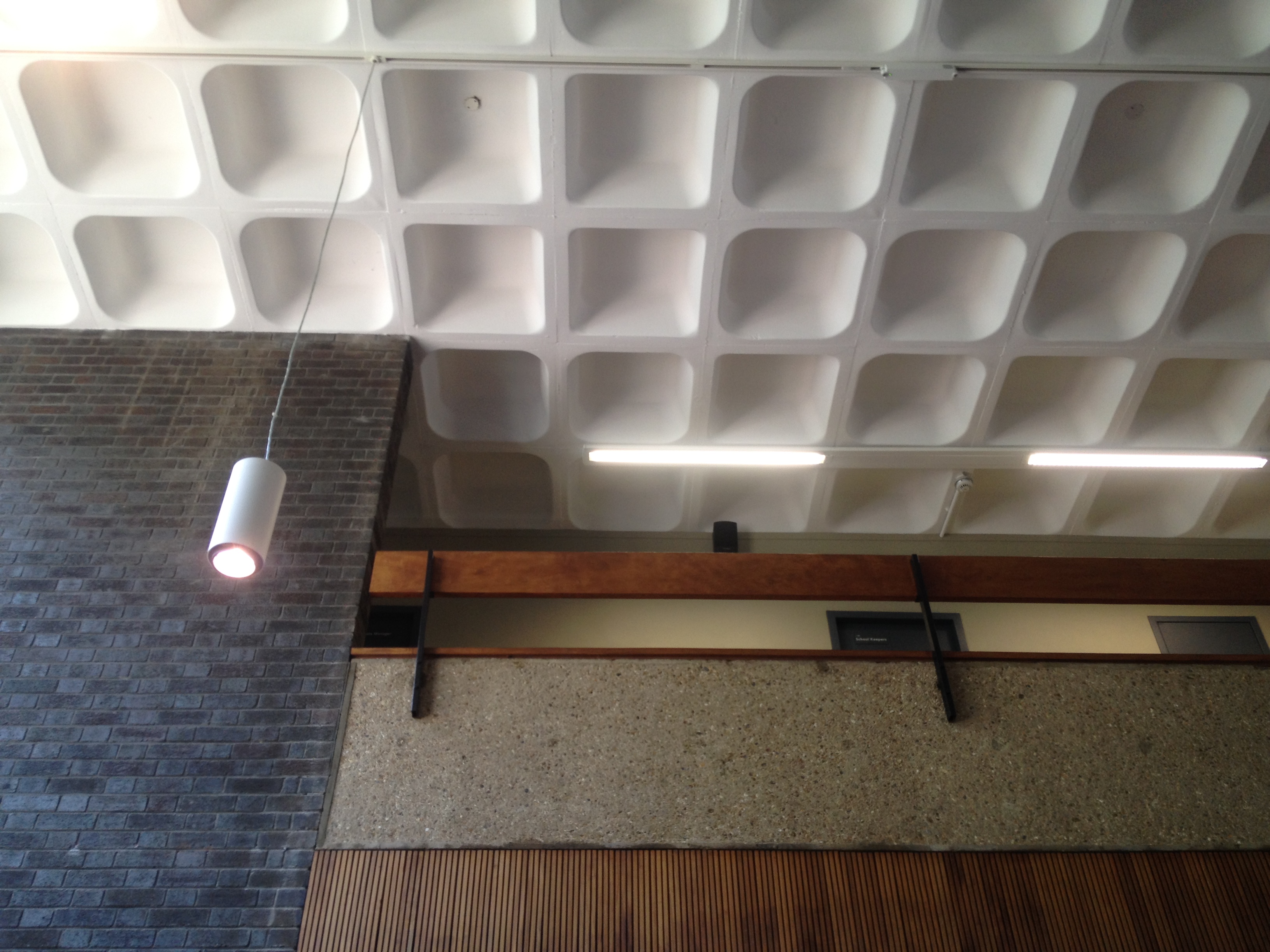 Due to a very sympathetic refurbishment in recent years, all of Goldinger’s original details, such as the recessed wall pockets for opened doors, the exposed waffle slab to the double-height lobby and the decorative carved concrete wall in the assembly hall have been retained and restored.