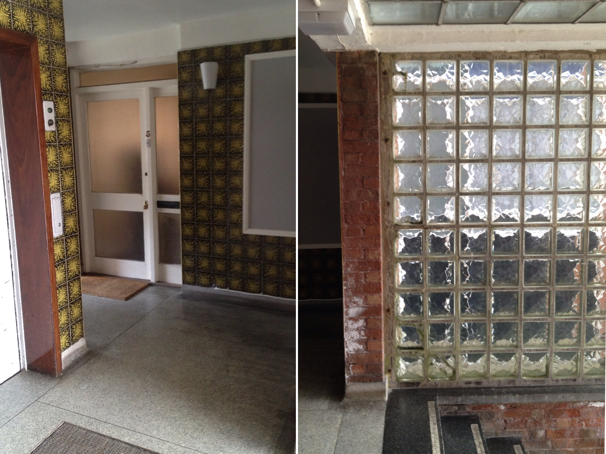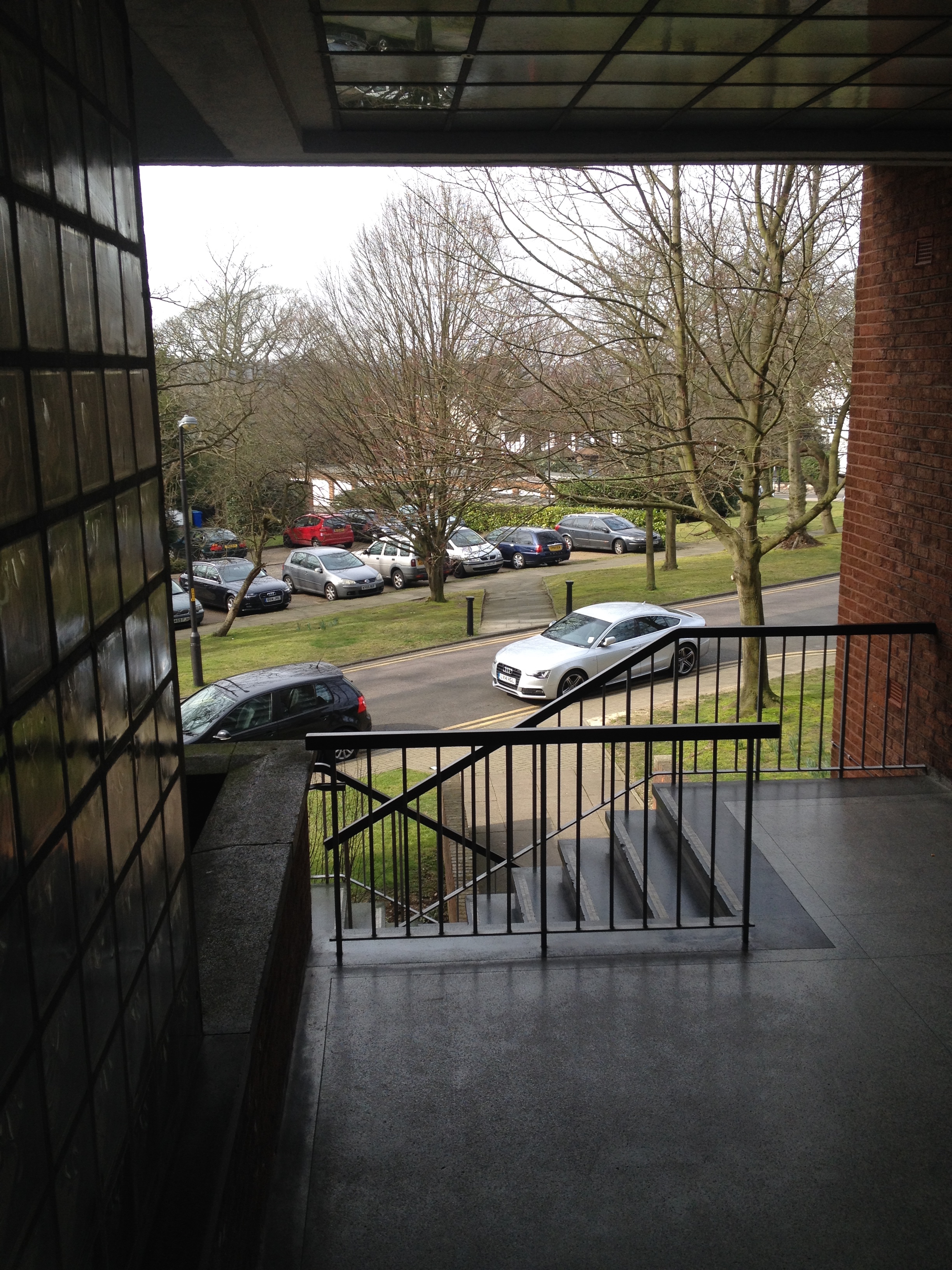 The apartment blocks are not Grade-listed but efforts seem to have been made (most likely by the Dulwich Estate which owns and maintains the Dulwich Wood Park Estate and a militant Residents’ Association) to preserve the original character of the grounds and the exterior facing elements of the flats: there’s a notable absence of uPVC windows and things like door fittings appear to be original. The heavily stylised communal areas, decorated in various shades of green, 1950s patterned tiling and teak panelling, have also been preserved but could in all honesty do with a bit of a spruce up: the overall appearance is retro and shabby rather than glamorous. The same goes for the original, slightly juddering 1950s lift.