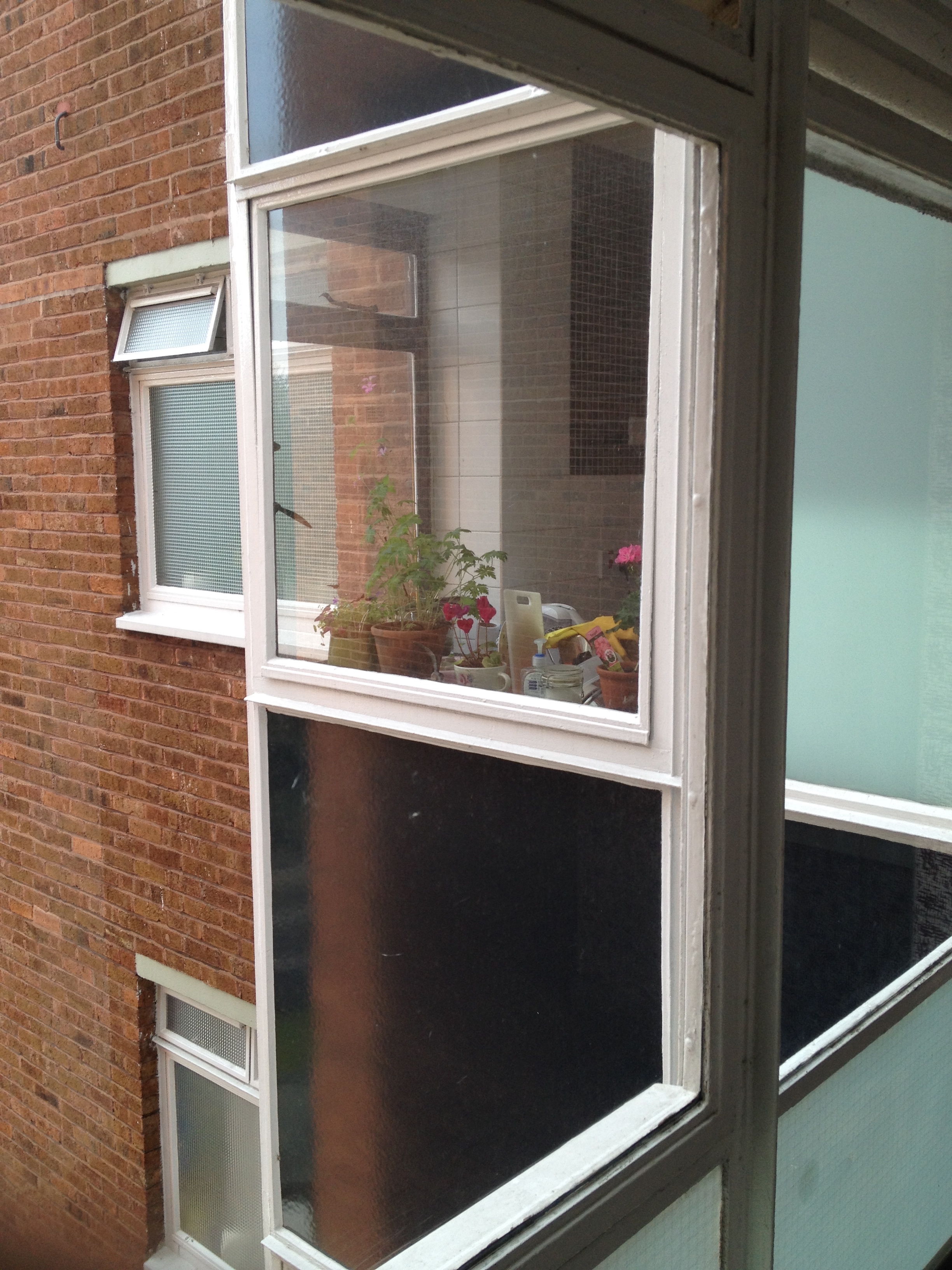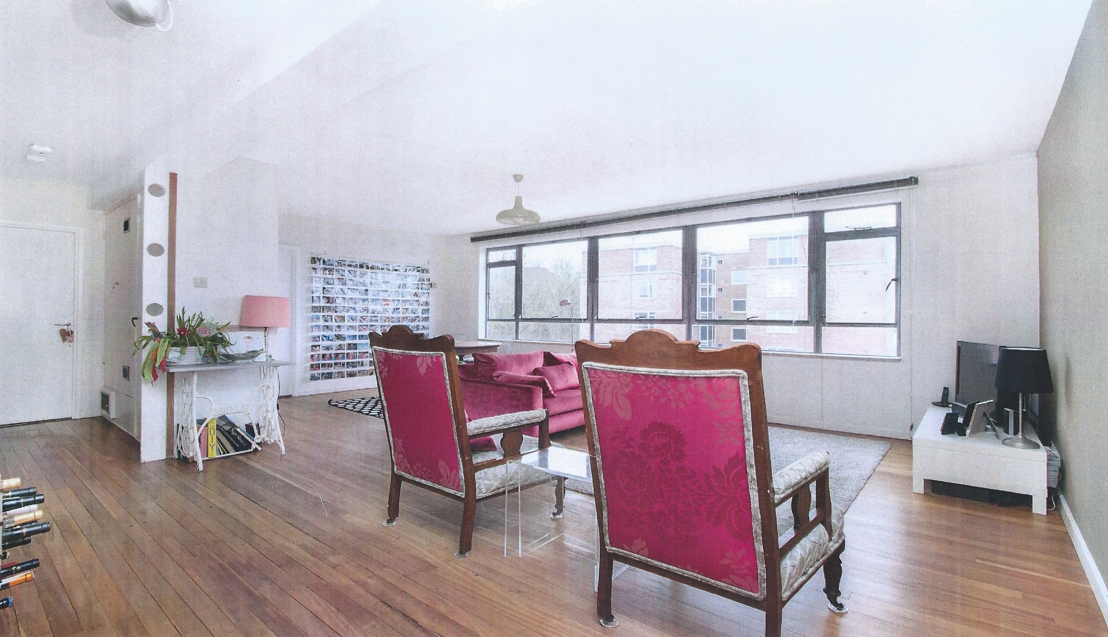 The flat that I viewed was a large 2-bed on the 6th floor. It was laid out in the standard configuration for 2-beds on the estate: entrance hall opening into a large open plan living/dining room with the original steel-framed window spanning almost the entire length of the long wall and bedrooms of equal size at the back of the flat. The original teak flooring and built-in storage were present and correct but the the bathroom suite looked a bit 80s and the kitchen looked a bit early 00s (neither particularly good eras for design). The high ceilings, open layout and large footprint (around 75 sq metres) contributed to an overall sense of space.