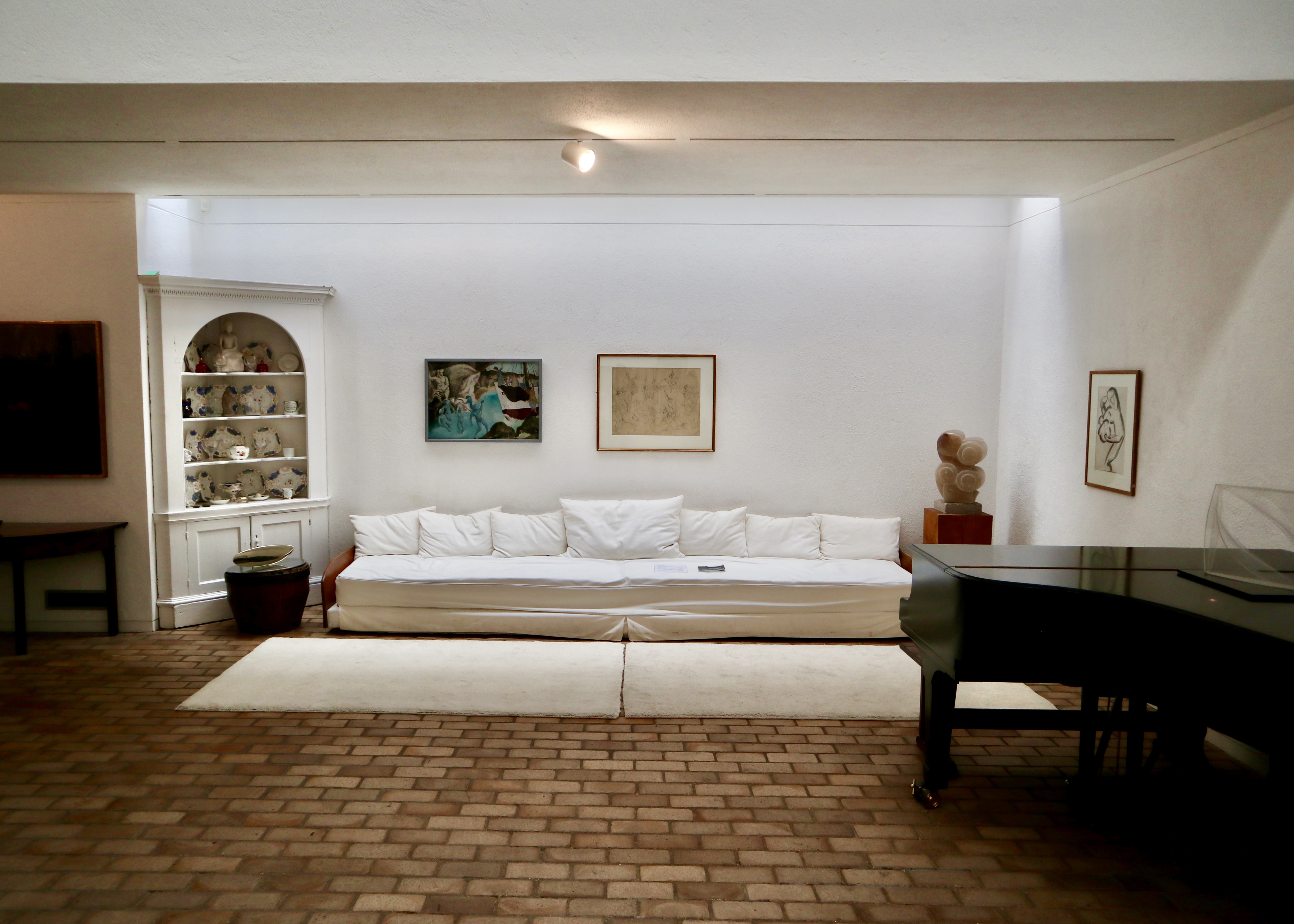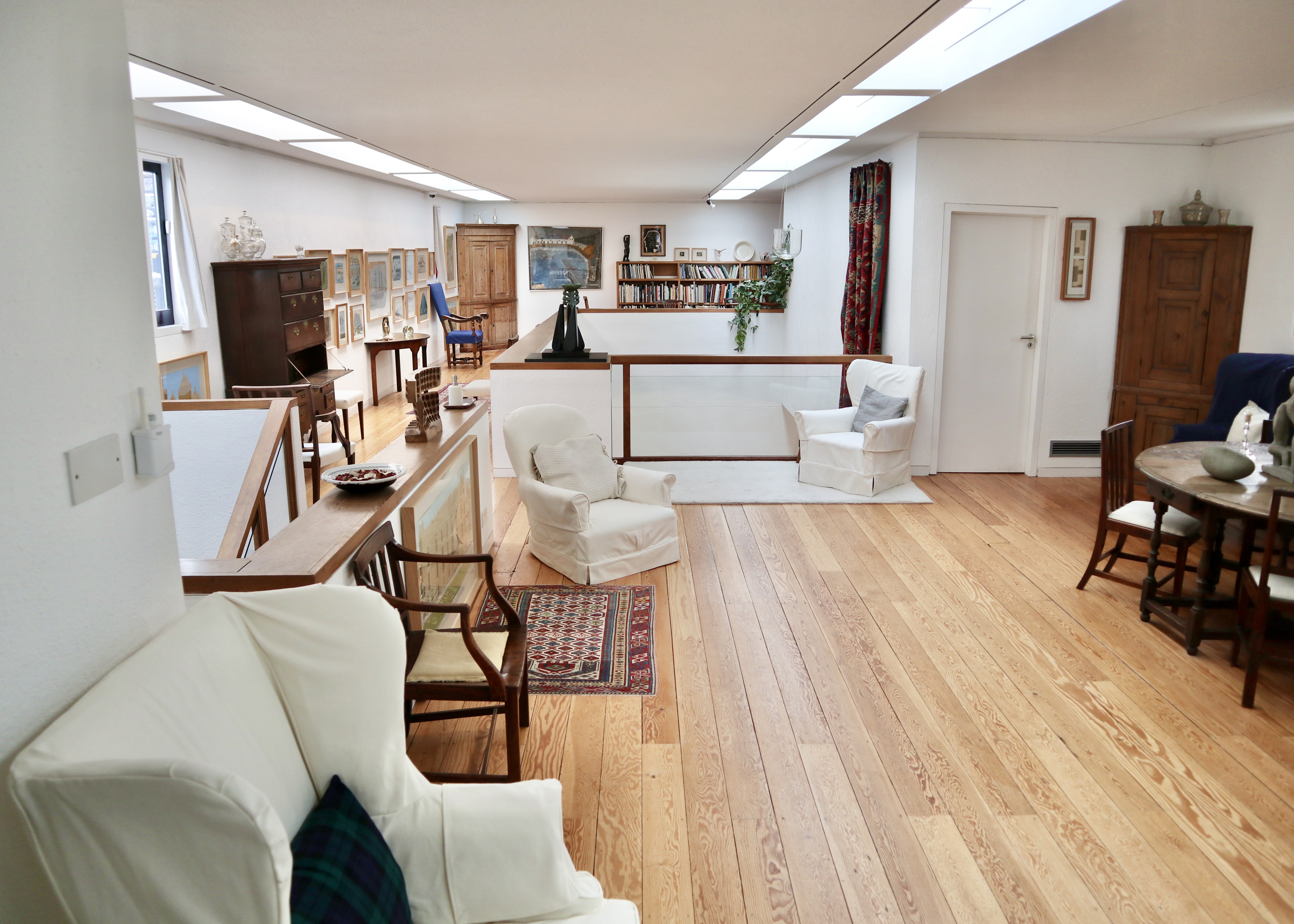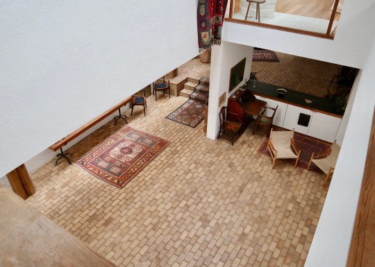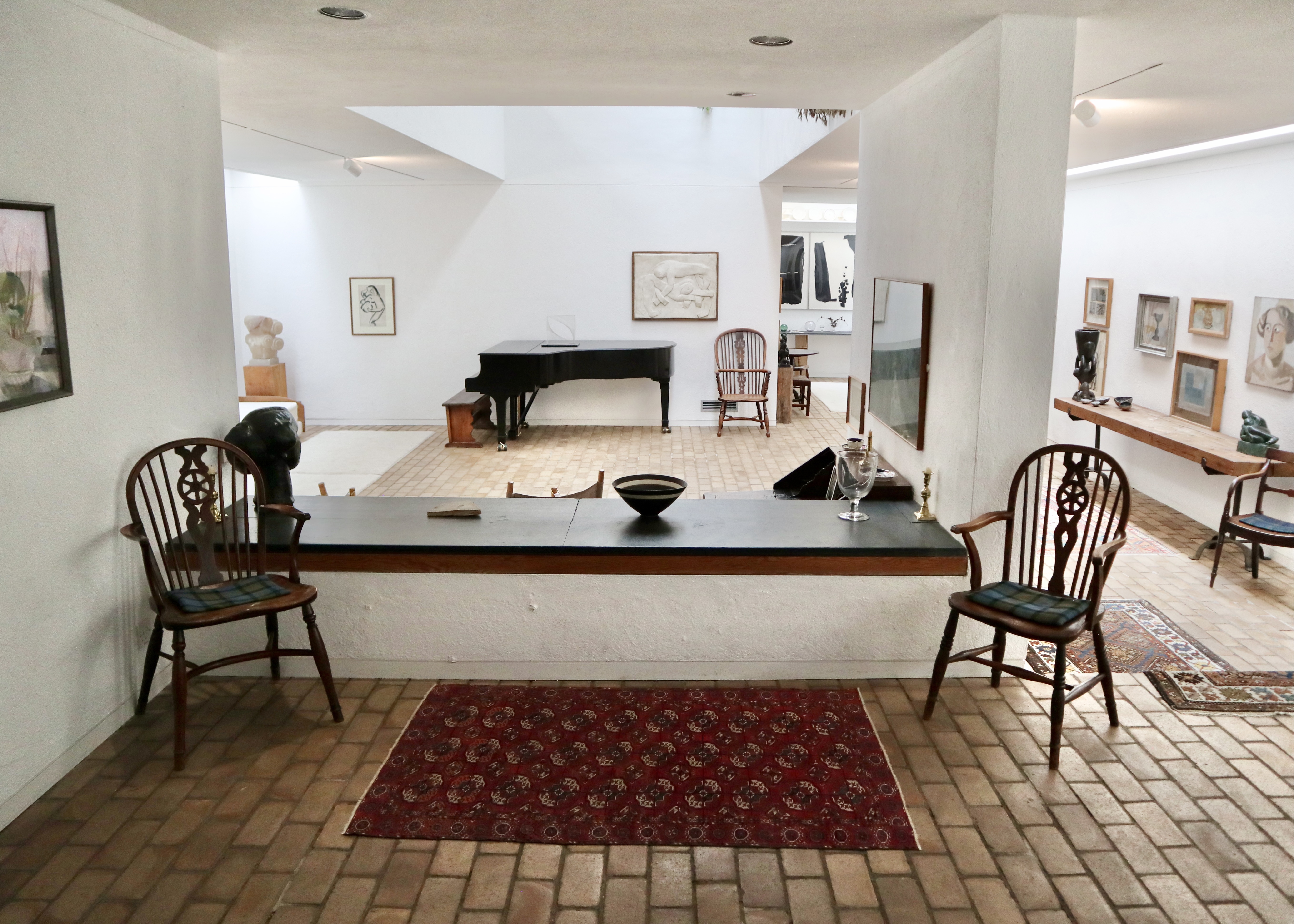 The original wing of the house was connected to the newer wing by a bridge link/small conservatory on the upper floor. Crossing the bridge, you went from the slightly claustrophobic spaces of the original cottages to jaw dropping, full-on, double height 1960s modernism. This provided more of a gallery-like setting for the rest of the collection and the downstairs area was also large enough to be used for live music events as requested by Jim when he gave the house to the University of Cambridge.