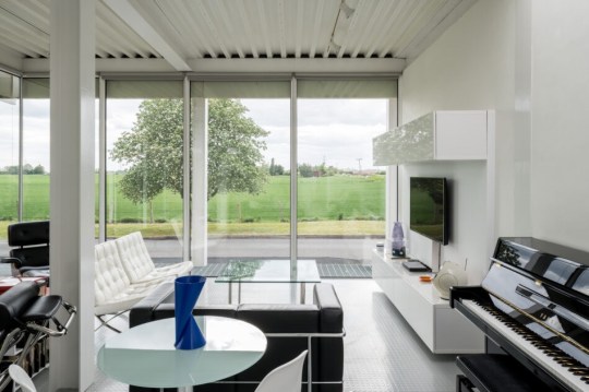 The house was constructed using mostly steel and glass with a galvanised steel structural roof, the front elevation composed entirely of sliding doors opening out onto the Cambridgeshire Fens and offering views across agricultural land.