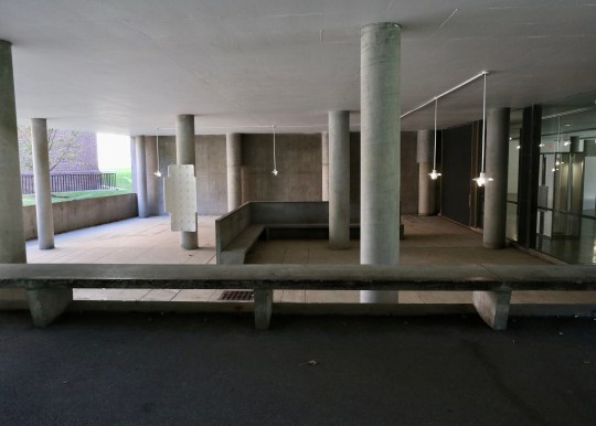 Sandwiched between more traditional red brick Harvard campus buildings, the site that Le Corbusier had to build on was relatively small resulting in a compact, roughly cylindrical structure bisected by an S-shaped concrete ramp going up to the core of the building on the third floor containing various glass-walled studios and exhibition spaces. The ramp was supported by a few pilotis and cantilevered from a central spine containing a lift.