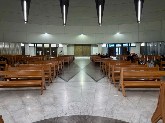 Inside, the space was vast yet calm. The interior was circular in plan, 71 metres in diameter and designed to hold up to 11,000 standing or 6,000 seated visitors. Sixteen chapels were positioned around the perimeter, while the central altar – crafted from white marble and local Modica stone by Giancarlo Marchese – held the image of the Madonna delle Lacrime alongside an 18th-century cross. The interior’s height and symmetry were softened by diffused natural light entering from above.