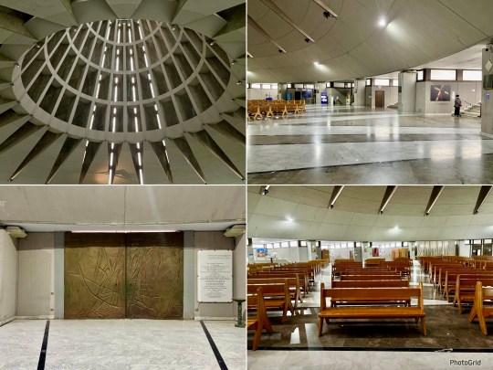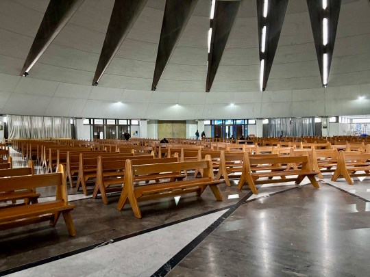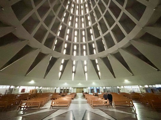 The basilica’s striking ceiling featured a dramatic radial pattern of concrete ribs that rose and tapered toward the centre, drawing the eye upwards.
